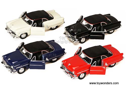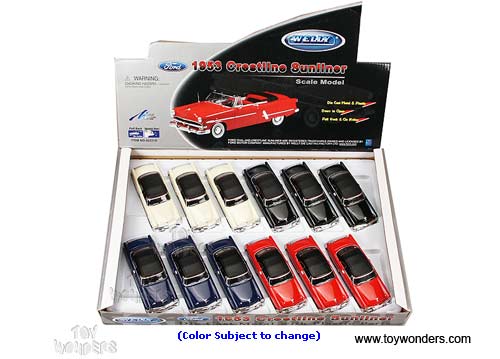 42331HD Welly - Ford Crestline Sunliner Soft Top. 1:34 - 1:39 scale diecast collectible model car. This Ford Crestline Sunliner is a 4.75"Lx 1.75"Wx 1.5"H die cast metal car with openable doors, and pull back motor action. This Ford Crestline Sunliner is manufactured by Welly. 12 pcs per display box and in assorted colors. 72 pcs per inner box.