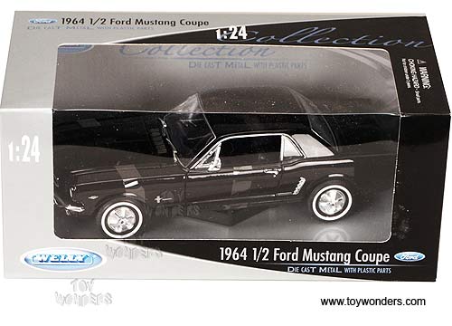 2451 Welly - 1964 1/2 Ford Mustang Coupe Hard Top. 1:24 scale diecast model car. This Ford Mustang Coupe is a 7"L x 2.5"W x 2"H diecast metal car with free wheeling, and openable doors & hood. Individually packed in a window box WB. Box measures 9"L x 4.25"W x 4"H. This Ford Mustang Coupe is manufactured by Welly. Item 2451 is in BLACK color.