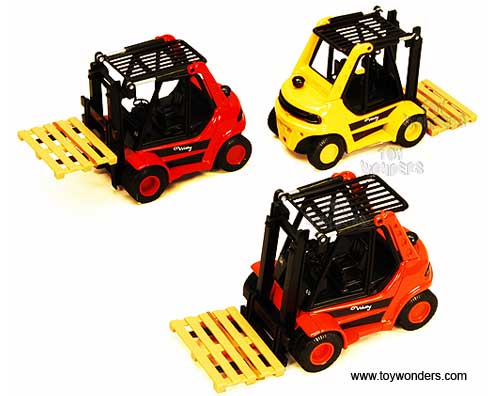 4"L die cast metal truck with pullback motor action, 1.75"L fork lift, adjustable/tilting fork lift height, and palette.