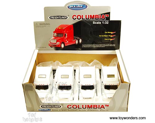 32620/4D Welly - Freightliner Columbia Tractor Trailer Truck. 1:32 scale diecast collectible model. This Freightliner Columbia is a 10"L x 3"W x 4.75"H diecast metal tractor trailer comes with free wheel and openable doors & hood. Manufactured by Welly. 4 pcs per display box and in WHITE color.