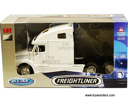 32620W Welly - Freightliner Columbia Tractor Trailer. 1:32 scale diecast collectible model. This Freightliner Columbia is a 10"L x 2.75"W x 4.5"H diecast metal with plastic parts and openable hood & doors. This Freightliner Columbia is manufactured by Welly. Individually packed in a window box. Box size: 11.5"L x 4.75"W x 6"H. 32620W is in WHITE color.