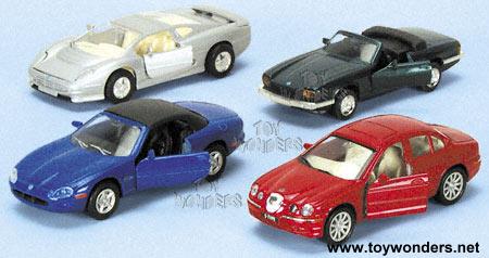 J9720D Jaguar Collection. 1:36 scale diecast model car. This Jaguar is a 4.5" long diecast metal luxury car with pullback motor action and opening doors. Assorted styles include: XJS, S-Type, XJ220, and XK8. This Jaguar is manufactured by Welly. 12 pcs per display box. 72 pcs per inner box.