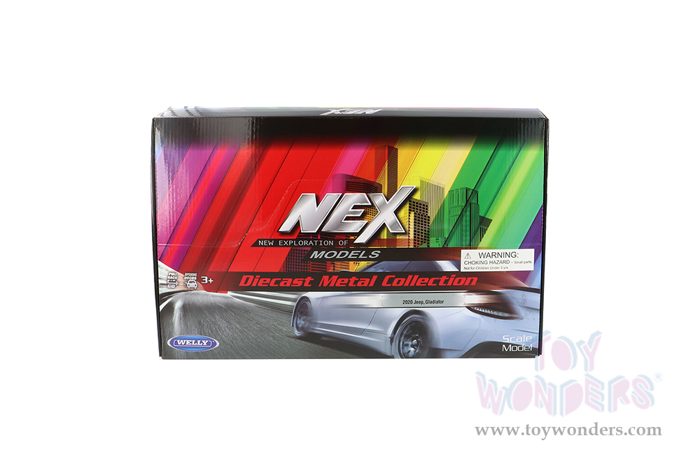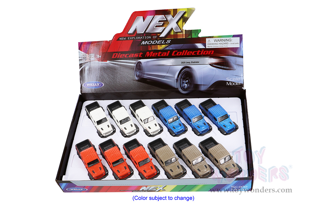 43788D Welly - 2020 Jeep® Gladiator Pickup Truck. 1/34 scale diecast collectible model car. This Jeep® Gladiator is a 4.75"L x 1.5"W x 1.5"H diecast metal car with openable doors and pullback motor action. This Truck is manufactured by Welly. 12 pcs per display box and in assorted colors. 72 pcs per inner box.