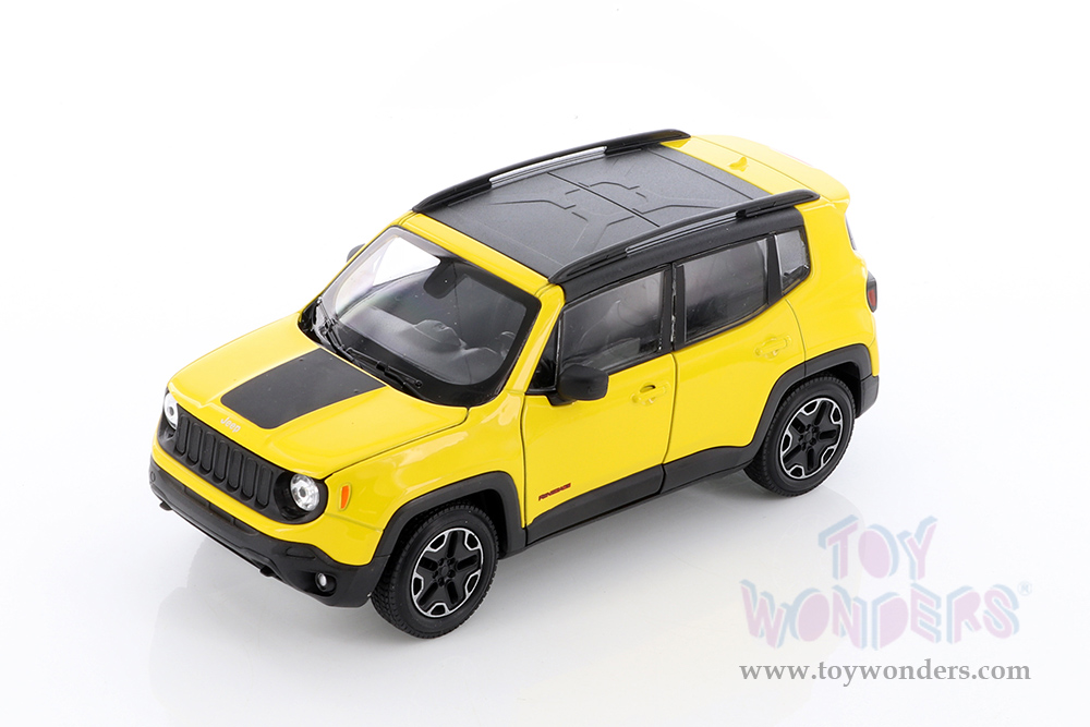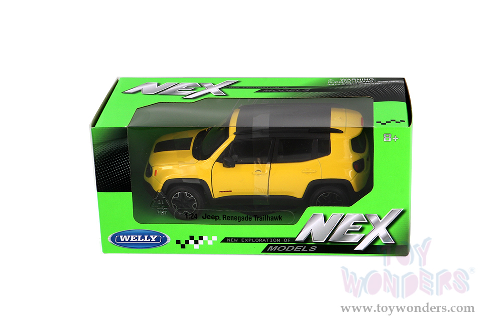 24071WYL Welly - Jeep® Renegade Trailhawk. 1:24 scale diecast collectible model car. This Jeep® Renegade is a 6.5"L x 3"W x 3"H, diecast metal car with freewheeling, openable doors, and hood. Detailed interior, exterior, engine compartment. This Jeep® Renegade Trailhawk is manufactured by Welly. Item 24071WYL is in Yellow. 6 pcs per inner box.