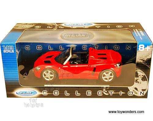 12511 Welly - 2001 Opel Speedster Convertible. 1:18 scale diecast collectible model car. This Opel Speedster is an 8"L x 3.5"W x 2.5"H diecast collection car with openable hood, doors & trunk. It features steerable front wheels, detail components, and is mounted on a display stand. This 2001 Opel Speedster is manufactured by Welly. Item 12511 is in RED color. Individually packed in a window box. Box size: 12.5"L x 6"W x 5"H.