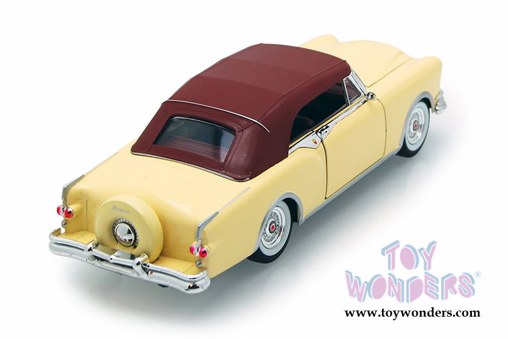 24016HW/CM Welly - 1953 Packard Caribbean Soft Top. 1:24 scale diecast collectible model car. This Packard Caribbean is a 7.75"L x 2.75"W x 2"H diecast metal car with freewheeling, openable doors and hood. Individually packed in a window box. Window Box measures 9"L x 4.25"W x 4"H. This 1953 Packard Caribbean is manufactured by Welly. Item 24016HW/CM is CREAM in color. 6 pcs per inner.