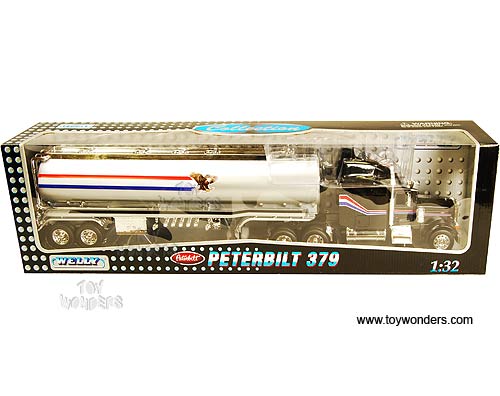 9942W Welly - Peterbilt 379 Tractor Trailer Oil Tanker with Decals. 1:32 scale diecast collectible model. This Peterbilt 379 Tractor-Trailer is a 21.75"L x 3"W x 5"H diecast metal, free wheel with openable doors. Individually packed in a window box. Box size: 24.25"L x 4.75"W x 6.75"H. This Peterbilt 379 is manufactured by Welly. 3 pcs per inner box. 9942W is in assorted colors.