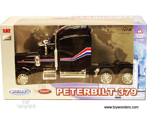 39940 Welly - Peterbilt 379 Tractor Trailer. 1:32 scale diecast collectible model. This Peterbilt 379 is a 10"L x 3.25"W x 4.5"H diecast metal with plastic parts and openable doors. This Peterbilt 379 is manufactured by Welly. Individually packed in a window box. Box size: 11"L x 4.5"W x 6"H. 39940 is in BLACK color.