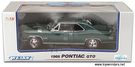 9856GN WELLY - 1966 Pontiac GTO Hard Top. 1:18 scale diecast model car. This 1966 Pontiac GTO is a 10.5"L x 4"W x 3"H diecast car with opening doors/hood, steerable front wheel, detail component, and a display stand. This 66 Pontiac GTO is manufactured by WELLY. 6 pcs per inner box. 9856 in GREEN color. Individually packed in a window box.