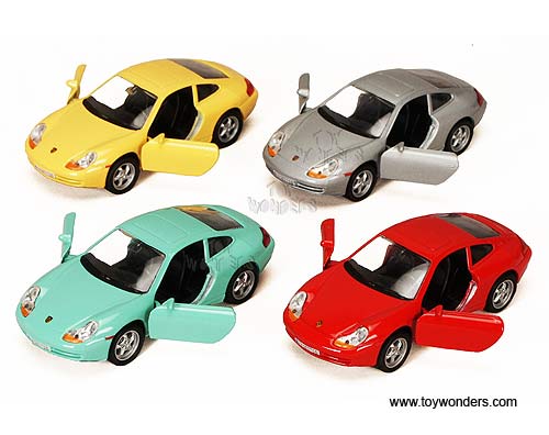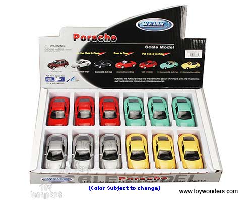 49747D Welly - 1997 Porsche 911 Hard Top. 1:34 - 1:39 scale diecast collectible model car. This Porsche 911 is a 4.5"Lx 1.75"Wx 1.25"H die cast metal car with openable doors and pull back motor action. This Porsche 911 is manufactured by Welly. 12 pcs per display box and in assorted colors. 72 pcs per inner box.