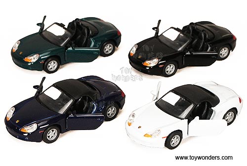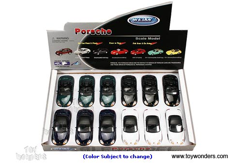 49729D Welly - Porsche Boxster Soft Top & Convertible. 1:34 - 1:39 scale diecast collectible model car. This Porsche Boxster is a 4.5"Lx 1.75"Wx 1.25"H die cast metal car with openable doors, and pull back motor action. This Porsche Boxster is manufactured by Welly. 12 pcs per display box and in assorted colors. 72 pcs per inner box.