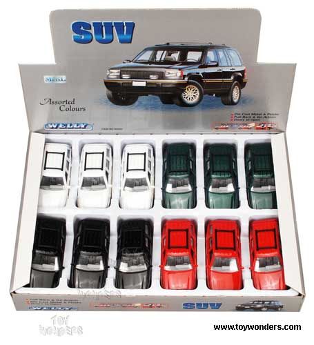 49690D Welly - Super Off-Roader SUV. 1:34 - 1:39 scale diecast collectible model car. This Super Off Roader SUV is a 4.75"Lx 2"Wx 1.75"H die cast metal car with open able doors & hatchback and pull back action. This sports utility vehicle is manufactured by Welly. 12 pcs per display box in assorted colors. 72 pcs per inner box.