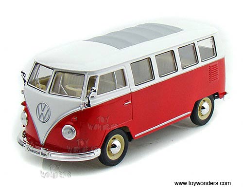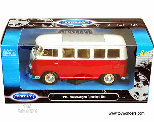 22095WR Welly - 1962 Volkswagen Classical Bus. 1:24 scale diecast collectible model car. This VW Classical Bus is a 6.75"L x 2.75"W x 2.75"H diecast metal car free wheeling with openable side door and hatchback. Individually packed in a window box. Window Box measures 9"L x 4.25"W x 4"H. This 1962 Volkswagen Classical Bus is manufactured by Welly. 6 pcs per inner box. Item 22095WR is RED and BEIGE two-tone colors.