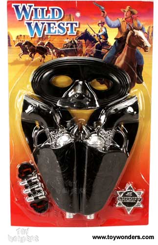 Sset includes two 7" pistol guns, a mask, bullets and a sheriff badge. Card size: 8.2" x 13.1". 24 pcs per inner.