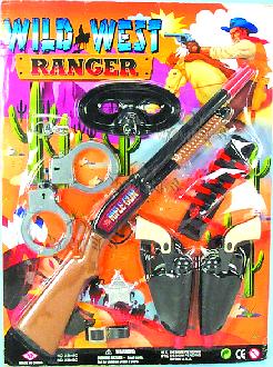 23841/2 Wild West Ranger. Cowboys and Indians play set includes plastic 19" rifle, bow & arrows, handcuffs, handguns, knife and more. Assorted styles. Blister card size: 15" x 20". Inner of 12 sets.
