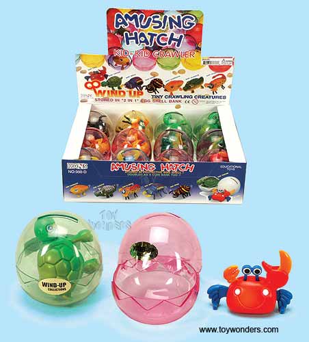 980D Wind Ups Amusing Hatch toy. Egg shape see-thru package with a coin slot located at the top, which allows this to also serve as a coin bank. The egg shape package has a flat base and measures 3" in height. This wind-ups is manufactured by Hans Novelty. 12 pcs/display box in 7 assorted styles. 72 pcs/inner box. This windups animal crawlers include spider, crab, tortoise, chameleon, alligator, scorpion and beetle.