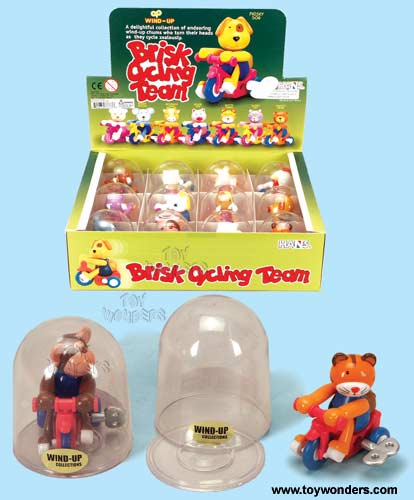 BC10KBD Wind Ups Brisk Cycling Team toy. This windups animal turns its head as riding a bicycle. Dome-shaped see-thru package measures 3" in height. This wind-ups bike is manufactured by Hans Novelty. 12 pcs/display box in assorted styles (sheep, mouse, cow, pig, tiger, cat and bear). 72 pcs/inner box.