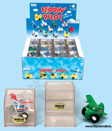 FP1BD Wind Ups Flippin' Pilot toy. This windups airplane can flip over. Individually packed in a see-thru rectangle hard plastic box. Box size: 2.25"Lx 2.25"Wx 1.75"H. This wind-ups manufactured by Hans Novelty. 24 pcs/display box in assorted styles and colors. 96 pcs/inner box.