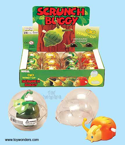 2K71D Wind Ups Scrunch Buggy Creature toy. Egg shape see-thru package with a coin slot located at the top, which allows this to also serve as a coin bank. The egg shape package has a flat base and measures 3" in height. This animal windups is manufactured by Hans Novelty. 12 pcs/display box in assorted colors. 72 pcs/inner box.