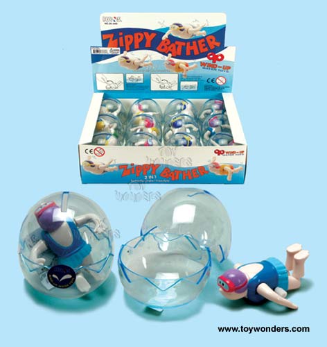 2K00D Wind Ups Zippy Bather swim toy. This windups toy moves it's arms and legs while swimming in the water. Egg shape see-thru package with a coin slot located at the top, which allows this to also serve as a coin bank. The egg shape package has a flat base and measures 3" in height. This wind-ups is manufactured by Hans Novelty. 12 pcs/display box in assorted styles and colors. 72 pcs/inner box.