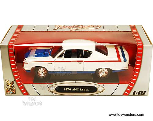 92778W ROAD SIGNATURE/ YATMING - 1970 AMC Rebel Hard Top. 1:18 scale diecast collectible model car. This AMC Rebel is an 11"L x 4.25"W x 2.75"H die cast metal car with openable doors & hood, free wheels. Road signature. This AMC Rebel is manufactured by Yat Ming. 92778W in WHITE color. Individually packed in a window box. Box size: 14"L x 6"W x 5.5"H.