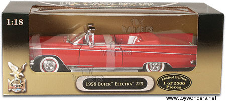 25980 YATMING/ ROAD SIGNATURE - 1959 Buick Electra 225 Convertible. 1:18 scale diecast collectible model car. This 1959 Buick Electra 225 is a 12"L x 4"W x 3"H diecast metal convertible with openable doors, hood and steerable front wheel. Sits on a display stand. This 59 Buick Electra 225 is manufactured by Yatming. Limited Edition 1 of 2,500 pcs. GM is a trademark of the General Motors Corporation. RED color. Individually packed in a window box.