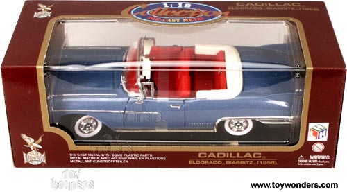 92158BU/1 YATMING/ ROAD SIGNATURE - 1958 Cadillac Eldorado Biarritz Convertible. 1:18 scale diecast collectible model car. This Cadillac Eldorado Biarritz is a 12"Lx 4.5"Wx 2.75"H die cast metal car with openable doors, hood & trunk. Sits on a display platform. This Cadillac Eldorado Biarritz is manufactured by Yat Ming. Individually packed in a window box. Box size: 14"Lx 6"Wx 5.25"H. 92158 in BLUE color. GM is a trademark of the General Motors Corporation.