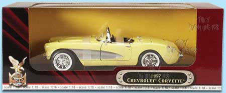 92018YL YATMING/ ROAD SIGNATURE - 1957 Chevrolet Corvette Convertible. 1:18 scale diecast car. This 1957 Chevy Corvette measures 9.5"Lx 3.5"Wx 2.75"H. This 57 Vette is diecast convertible with opening doors/trunk/hood, free wheels, and workable steering. Detailed engine and components. In terms of classic American cars, the 1957 Chevy Corvette is probably top 10. This 57 Chevy Corvette is from the Yat Ming Road Signature line. 92018 in YELLOW color. Individually packed in a window box.