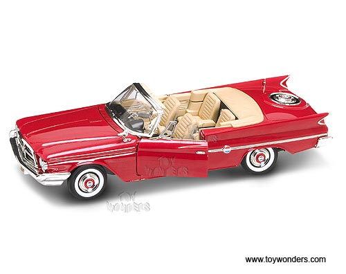 92748R Yatming / Road Signature - 1960 Chrysler 300F Convertible. 1:18 scale diecast collectible model car. This 1960 Chrysler 300 F Convertible is 12"L x 4.5"W x 2.75"H die cast metal with openable hood & doors. Workable steering and free wheels. Die Cast Metal Collection Deluxe Edition. This 60 Chrysler 300-F is manufactured by Yat Ming. Individually packed in a window box. Box size: 14.25"L x 6"W x 5.25"H. 92748R in RED color.