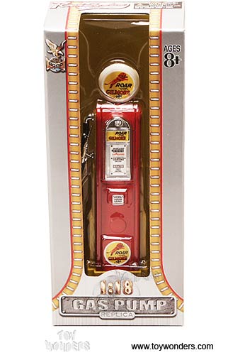 98731 YATMING ROAD SIGNATURE - Digital Gas Pump Roar with Gilmore. 1:18 scale diecast vintage car gas pump. 5.25" H diecast gasoline pump replica. Contains small detachable parts. This antique fuel gas pump was an iconic part service stations throughout America in the 1940s through late 1950s. Manufactured by Yat Ming. Classic gas pump for scale model cars. 12 pcs per inner box. Individually packed in a box. Box size: 3"W x 7.25"H x 1.75"D. This accessory is often used in 1/18 scale dioramas.