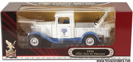 92257W YATMING ROAD SIGNATURE 1934 Ford Pick Up Wrecker. 1:18 scale diecast model. This 1934 Ford pick-up tow truck is a 10" long diecast with opening doors/hood/tailgate. This 34 Ford pickup tow-truck is manufactured by Yat Ming. 92257 in WHITE color with black. Individually packed in a window box.