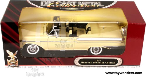 92578YL YATMING / ROAD SIGNATURE - 1957 Mercury Turnpike Cruiser Convertible. 1:18 scale diecast collectible model car. This 1957 Mercury Turnpike Cruiser is a 12.5"Lx 4.25"Wx 2.75"H die cast convertible with opening doors & hood, workable steering, and highly detailed engine and interior. Sits on a plaque. Die Cast Metal Collection Deluxe Edition. This 57 Mercury is manufactured by Yat Ming. 92578 in YELLOW color (BEIGE like color). Individually packed in a window box. Box size: 14"Lx 5.75"Wx 5.5"H.
