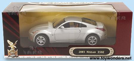 92538SV YATMING ROAD SIGNATURE 2003 Nissan 350Z. 1:18 scale diecast. This 2003 Nissan 350 Z is a 9"L x 3.75"W x 3"H diecast metal sports car with opening doors/trunk/hood, free wheels, and workable steering. Highly detailed engine and components. Sits on display plaque. Individually packed in a window box. Box is 14"W x 5.25"H x 6"D. This 03 Nissan 350-Z is manufactured by Yat Ming. 92538 in SILVER color.