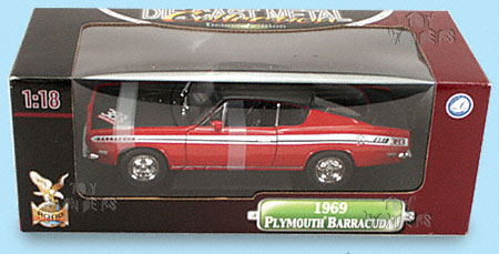92179R YATMING / ROAD SIGNATURE - 1969 Plymouth Barracuda. 1:18 scale diecast collectible model car. This Plymouth is 10.25"L x 3.75"W x 3"H. Detailed engine and interior. Diecast metal, classic muscle car has workable steering, free wheels, opening doors & hood. Manufactured by Yat Ming. Sits on a display plaque. Individually packed in a window box. Box measures 14"W x 5.25"H x 6"D. 92179 in RED color with Black top.