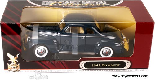 92398BU YATMING ROAD SIGNATURE 1941 Plymouth Hard Top. 1:18 scale diecast car. This 1941 Plymouth is an 11"L x 4"W x 3.25"H diecast metal classic oldie car with opening doors/trunk/hood, free wheels, and workable steering. Highly detailed engine and components. This 41 Plymouth is manufactured by Yat Ming. Individually packed in a window box. Box is 14"W x 5.25"H x 6"D. 92398 in BLUE color.