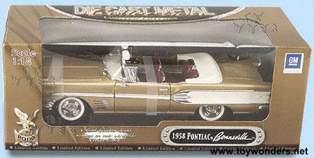 92437G YATMING ROAD SIGNATURE - 1958 Pontiac Bonneville Convertible. 1:18 scale diecast car. This 1958 Pontiac Bonneville is an 11.75"L x 4.5"W x 3"H diecast metal classic oldies car with opening doors/hood, free wheels, and workable steering. Highly detailed engine and interior. Seats car covered with soft, simulated leather. Sits on display plaque. This 58 Pontiac Bonneville is manufactured by Yat Ming. Box measures 14"W x 5.25"H x 6"D. 92437 in GOLD color. Individually packed in a window box WB. GM is a trademark of the General Motors Corporation.