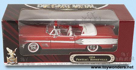 92438R YATMING ROAD SIGNATURE 1958 Pontiac Bonneville Convertible. 1:18 scale diecast car. This 1958 Pontiac Bonneville is an 11.75"L x 4.5"W x 3"H diecast metal classic oldies car with opening doors/hood, free wheels, and workable steering. Highly detailed engine and interior. Seats car covered with soft, simulated leather. Sits on display plaque. This 58 Pontiac Bonneville is manufactured by Yat Ming. Individually packed in a window box. Box measures 14"W x 5.25"H x 6"D. 92438 in RED color. GM is a trademark of the General Motors Corporation.
