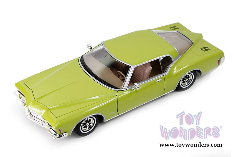 92558GN Yatming Road Signature - 1971 Buick Riviera GS Hard Top. 1:18 scale diecast collectible model car. This Buick Riviera is an 11.5"L x 4.25"W x 2.75"H die cast metal with workable steering, and openable doors & hood. Highly detailed engine and interior. The 71 Buick Riviera GS is manufactured by Yat Ming. 92558GN is in GREEN color. GM is a trademark of the General Motors Corporation. Individually packed in a window box. Box size: 14"L x 5.75"W x 5.25"H.