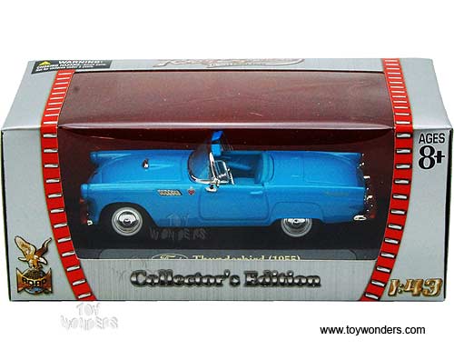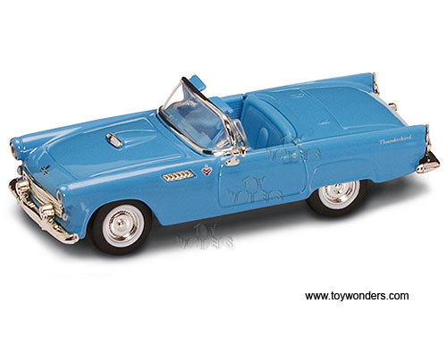 94228BU Yatming Road Signature - 1955 Ford Thunderbird Convertible. 1:43 scale diecast collectible model car. This Ford Thunderbird is a 4"L x 1.5"W x 1"H diecast metal car. Sits on a display plaque. Road Signature collection. The 1955 Ford Thunderbird is manufactured by Yat Ming. 94228BU is BLUE in color. Individually packed in a window box. Box size: 6"L x 3"W x 2.5"H. 12 pcs per inner.