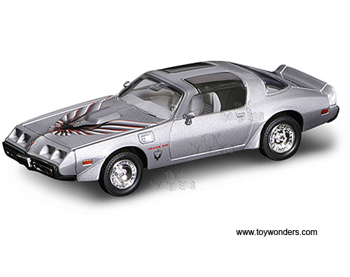 94239SV Yatming Road Signature - 1979 Pontiac Firebird Trans Am T-Top. 1:43 scale diecast collectible model car. This Pontiac Firebird Trans Am is a 4.5"L x 1.5"W x 1.25"H diecast metal car. Sits on a display plaque. Road Signature collection. This 1979 Pontiac Firebird Trans Am is manufactured by Yat Ming. 94239SV is SILVER in color. Individually packed in a window box. Box size: 6"L x 3"W x 2.5"H. 12 pcs per inner. GM is a trademark of the General Motors Corporation.