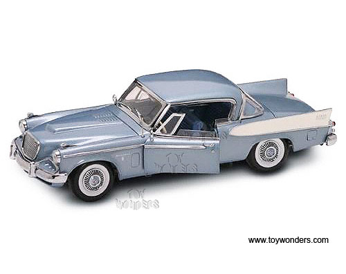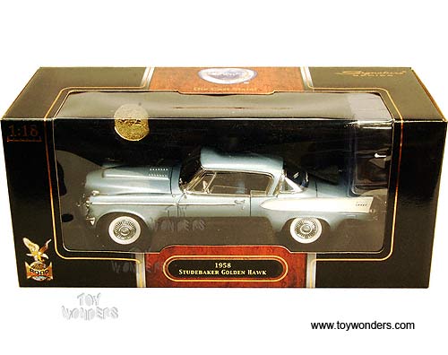 20018 Yat Ming Road Signature - 1958 Studebaker Golden Hawk Hard Top with 24K Gold Plated Coin. 1:18 scale diecast collectible model car. This Studebaker Golden Hawk is a 11"L x 3.75"W x 3"H die cast metal car with openable hood, doors & trunk, free wheels. Road Signature collection. This 58 Studebaker Golden Hawk is manufactured by YatMing. 20018 is in BLUE color. Individually packed in a window box. Box size: 15"L x 6.25"W x 6.5"H.