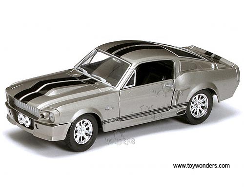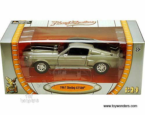 24206 Yatming - 1967 Shelby GT500 Hard Top. 1:24 scale diecast collectible model car. This Shelby GT-500 is a 7.5"L x 2.75"W x 2"H diecast metal car with free wheeling, and openable doors. Individually packed in a window box WB. Box measures 10.25"L x 4.75"W x 4.25"H. This 1967 Shelby GT500 is manufactured by Yat Ming. Item 24206 is in GREY color with Black stripes.