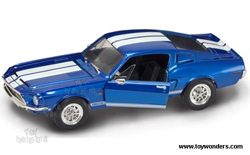 92168 Yat Ming Road Signature - 1968 Shelby Mustang GT-500KR Hard Top. 1:18 scale diecast collectible model car. This Shelby GT500KR is a 10.25"Lx 4"Wx 2.75"H die cast metal car with openable hood & doors, free wheels. Sits on a display plaque. Road Signature collection. The Shelby GT 500KR is manufactured by YatMing. 92168 in BLUE color with White stripes on top. Individually packed in a window box. Box size: 14.25"Lx 6"Wx 5.25"H.