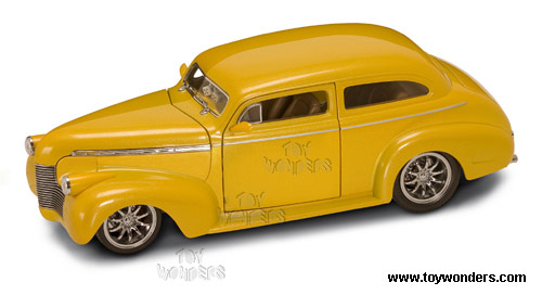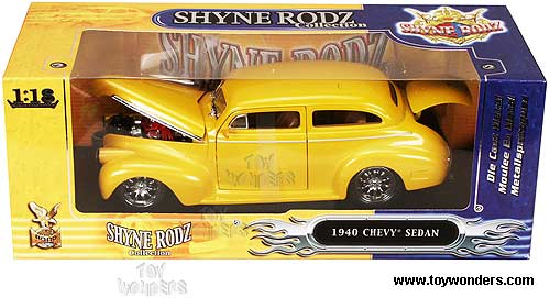 30128YL YAT MING Shyne Rodz - 1940 Chevy Sedan Hard Top w/ two dices. 1:18 scale diecast model car. This Chevrolet Sedan is a 10"Lx 3.5"Wx 3"H die cast metal car with openable hood, doors & truck, free wheels & workable steering. Sits on a display plaque. Shyne rodz collection. This Chevrolet is manufactured by YatMing. Road Signature. 30128 in YELLOW color. Individually packed in a window box. Box size: 14.25"Lx 5.75"Wx 5.25"H. GM is a trademark of the General Motors Corporation.