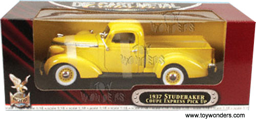 92458YL YATMING ROAD SIGNATURE 1937 Studebaker Pick Up. 1:18 scale diecast model car. This Classic oldies car is 11"L x 4"W x 3.25"H diecast metal pickup truck with opening doors, free wheels and workable steering. This 1937 pick-up truck has highly detailed engine and components. This 37 pick up truck is manufactured by Yat Ming. Individually packed in a window box. Box is 14"W x 5.25"H x 6"D. 6 pcs per inner box. 92458 in YELLOW color.