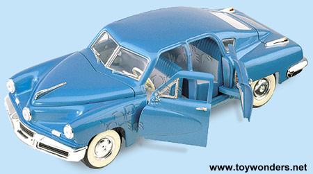 92268BU/1 SIGNATURE/YATMING 1948 Tucker Torpedo. 1:18 scale diecast car. Detailed engine & interior. Diecast metal, classic oldies car has workable steering, free wheels, opening doors/hood/trunk. Sits on a display plaque. Box measures 14"W x 5.25"H x 6"D. 92268 in BLUE color.