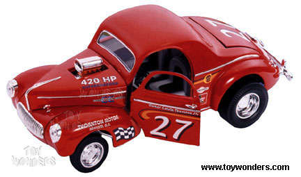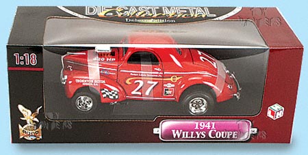 92278R YATMING ROAD SIGNATURE 1941 Willys Coupe. 1:18 scale diecast car. This 1941 Willys Coupe is a classic oldies car with detailed engines and interior, workable steering, free wheels, and opening doors/hood/trunk. Sits on a display plaque. Individually packed in a window box. Box measures 14"W x 5.25"H x 6"D. This 41 Willys Coupe is manufactured by Yat Ming. 92278 in RED color.