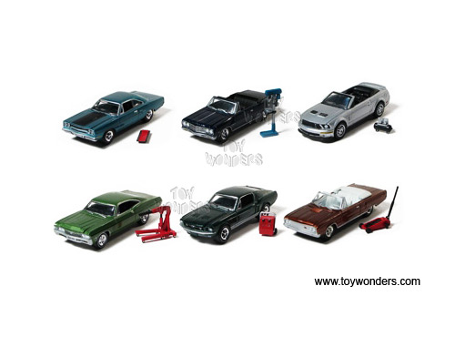 28610 Greenlight Muscle Car Garage - Hobby Collection Series 1. 3" long die cast cars with openable hood. Each car individually blister carded. Bonus garage tool accessories. 12 pcs/inner. Card size: 5.5" x 7.5". These cars are manufactured by Greenlight. GM is a trademark of the General Motors Corporation. Assortment includes: