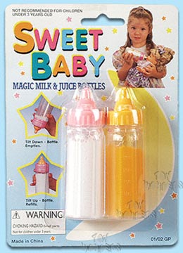 9101/2 Magic Juice & Milk Bottles. Two 3.5" milk and juice bottles with real flowing liquids. When tilt down, bottle empties. When tilt up, bottle refills. Card size: 5"x7".