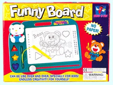 100 Funny Board. 12.75" wide drawing board. Includes 1 pen and 3 drawing shapes. Draw on the board then move the spring lever on the button to erase your work. WOW! Box size: 13"W x 9.75"H x 2"W. 12 pcs/inner.